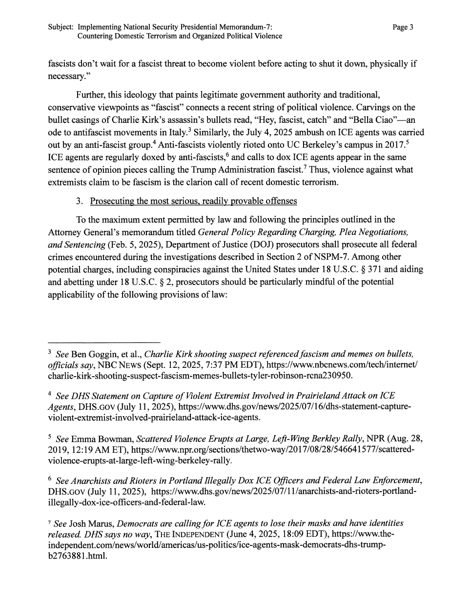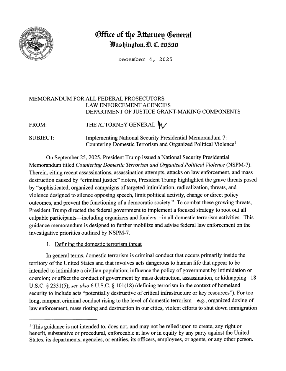 The memo, sent to all federal prosecutors, law-enforcement agencies, and DOJ grant-making offices, carries out National Security Presidential Memorandum-7 (NSPM-7), which Trump signed on September 25, 2025. Its stated purpose is to reorganize federal law-enforcement priorities around what the administration defines as domestic terrorism and organized political violence.