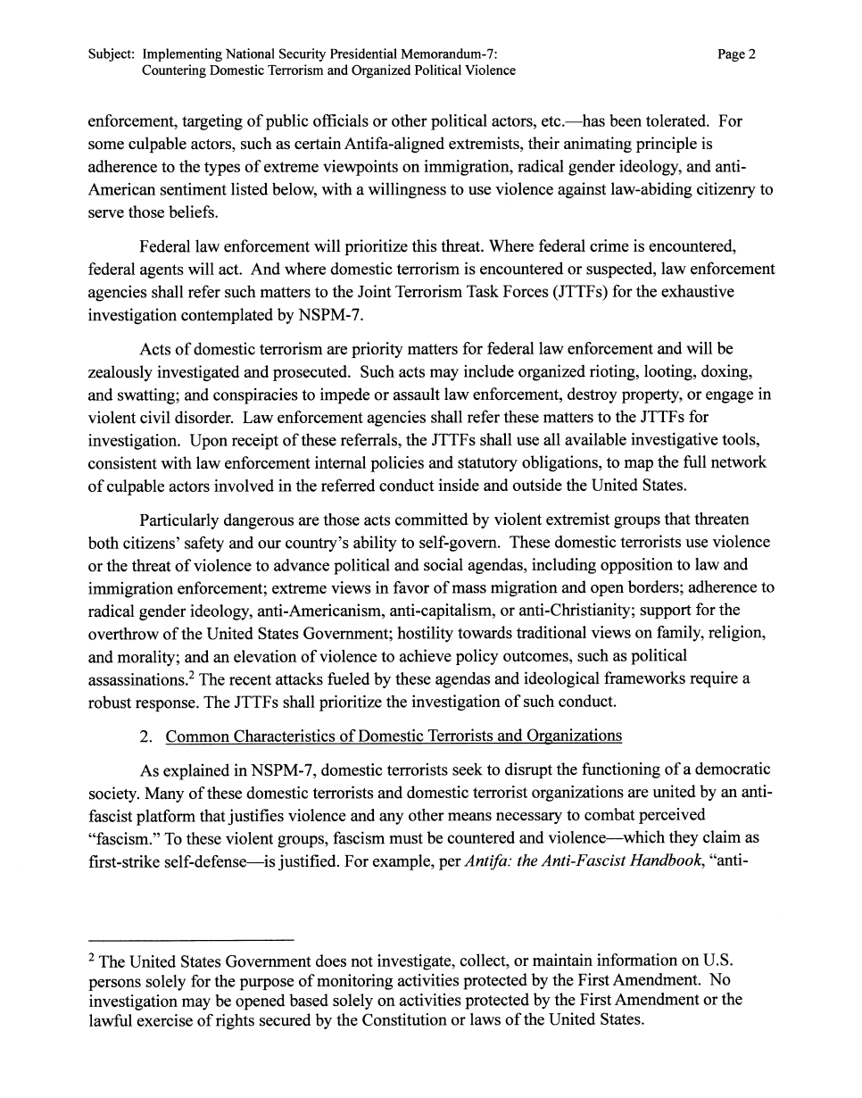 The document acknowledges, in a footnote, that First Amendment-protected activity alone is not intended to trigger investigation. However, throughout the memo, ideological positions, protest activity, and civil disorder are repeatedly linked to terrorism frameworks and national-security enforcement mechanisms.