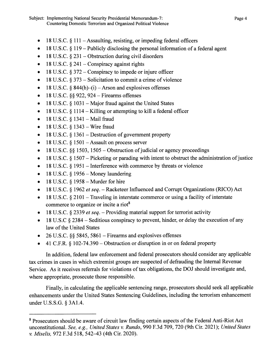 The memo orders federal prosecutors to pursue the “most serious, readily provable offenses,” encouraging the use of conspiracy charges, terrorism sentencing enhancements, RICO statutes, and related federal crimes. It lists more than two dozen statutes prosecutors should consider, including obstruction, firearms offenses, arson, sedition, and material support for terrorism.