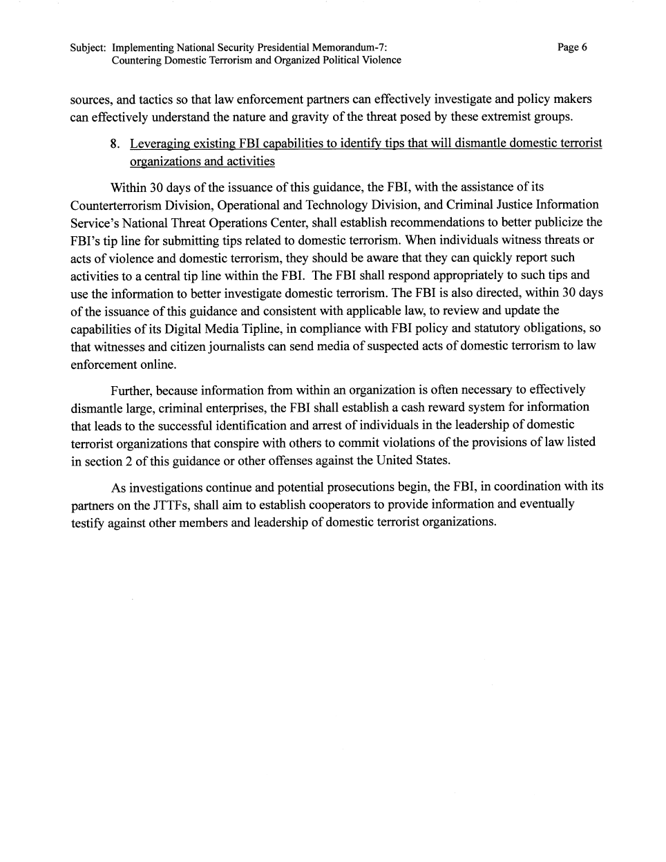 Bondi also instructs the FBI to expand and publicize its tip line, update digital submission tools so members of the public and citizen journalists can upload material, and establish a cash-reward system for information leading to the identification and arrest of leadership figures within targeted organizations.