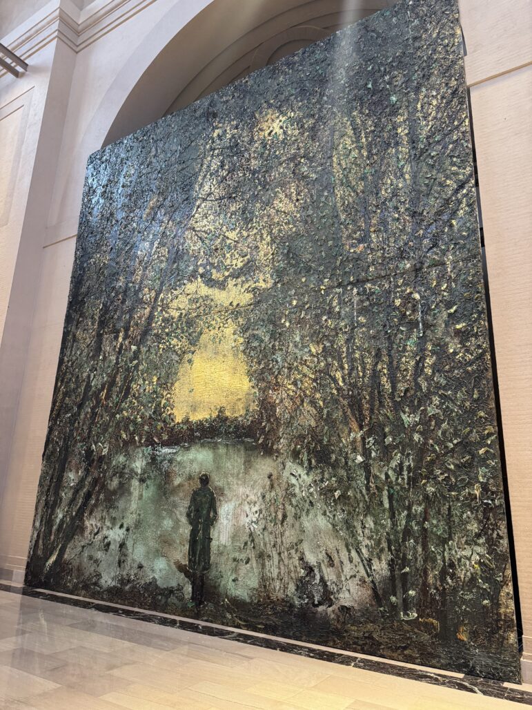 Those two colors – the gold and the turquoise – play together against the dark-hued strokes of tree and leaf to represent a calm river at sunset. A single figure in the center – Anselm himself – contemplates nature in all her sublime mystery, like the protagonist of Caspar David Friedrich’s “Wanderer above the Sea of Fog.”