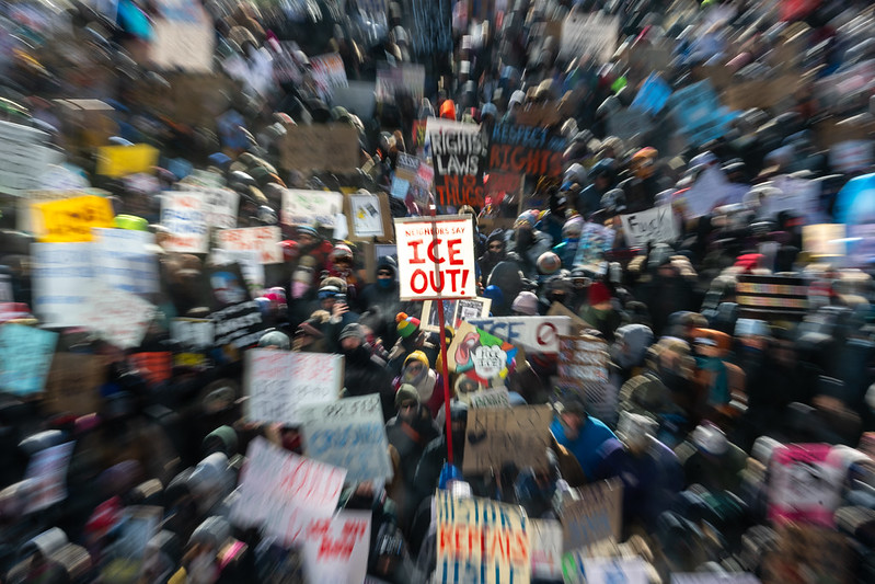 In the midst of the crowd at the Minnesota General Strike on January 23, 2026, a sign that reads “ICE OUT!” [Flickr, Lorie Shaull, CC 2.0]