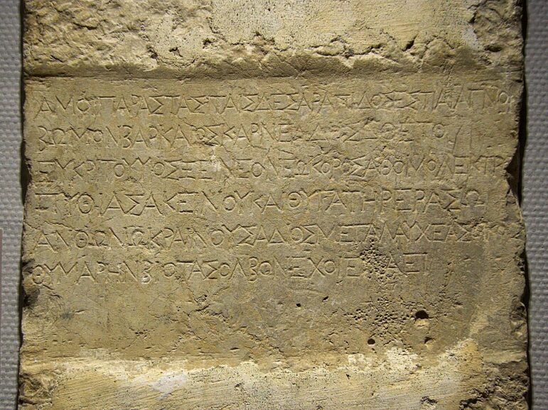 Metric dedication of an altar to Hestia from Karneades of Barke, his wife Pythias and their daughter Eraso beside the Temple of Serapis (IG XIV 433). Lapidary and epigraphic collection of the Greek Theatre of Taormina. Found in Taormina. Inscriptionː “Beside these walls of Serapis the warden of the temple Karneades of Barke, son of Eukritos, o foreigner, and his spouse Pythias and his daughter Eraso placed to Hestia a pure altar, as a reward for this, o you that governs the marvellous dwellings of Zeus, grant to them a lovely auspiciousness of life.” [Zde, Wikimedia Commons, CC 4.0]