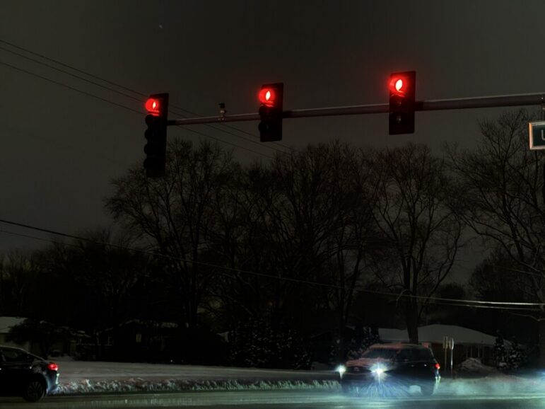 A view of the Eastbound Renwick Road traffic signal (red phase) at the Renwick Road and U.S. Route 30 intersection in Plainfield, Illinois. (December 2025) [Wikimedia Commons, Illinois_Roadbuff (Rouge Jr), CC 4.0]