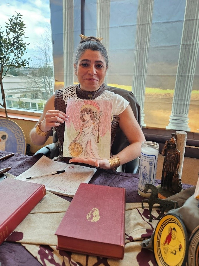 Then it was time for everyone to visit temples. This time I brought my art portfolio and sketchbook with me. I’ve been working on portraits of the deities for over a year now. I asked each of them to autograph their portraits for me. I was surprised at how much they liked them. Athena even asked her devotee to get a picture of it for her vessel. She said that it “was perfection.” Demeter nearly cried and called everyone nearby to come see. I felt loved and important.