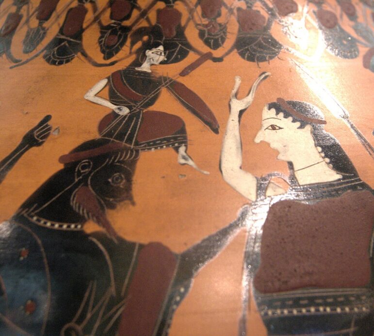 Amphora depicting the birth of Athena from the head of Zeus, with Eileithyia, the goddess of childbirth, on the right. [public domain